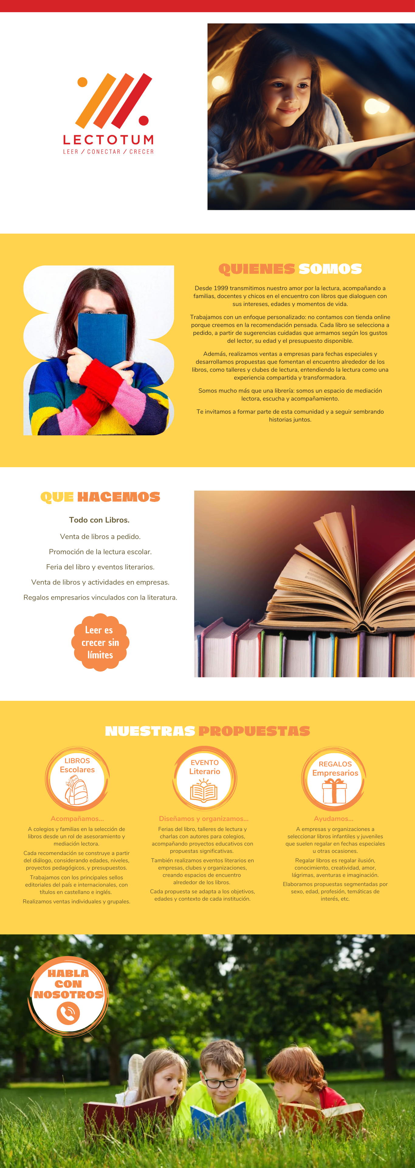 Además de vender todo tipo de libros a pedido, realizamos actividades literarias y organizamos diferentes clases de eventos relacionados con la lectura en colegios, empresas y organizaciones.
